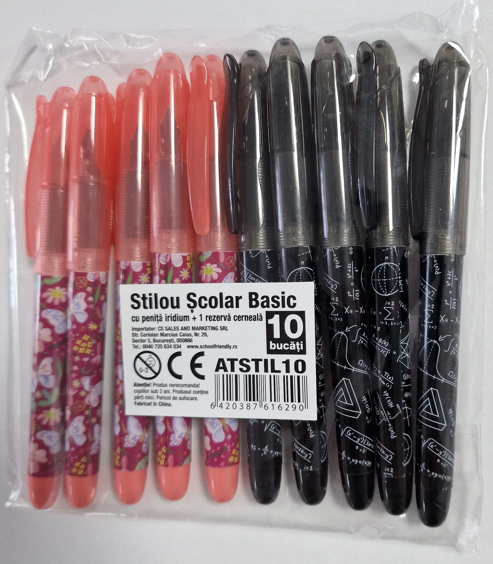 Set de 10 stilouri școlare Basic cu design mat negru și modele colorate, ideale pentru elevi și studenți. Fiecare stilou include peniță iridium durabilă și rezervă cerneală inclusă, oferind scris confortabil și fluid. Perfecte pentru școală, birou sau cadou, stilourile combină calitate și preț accesibil.