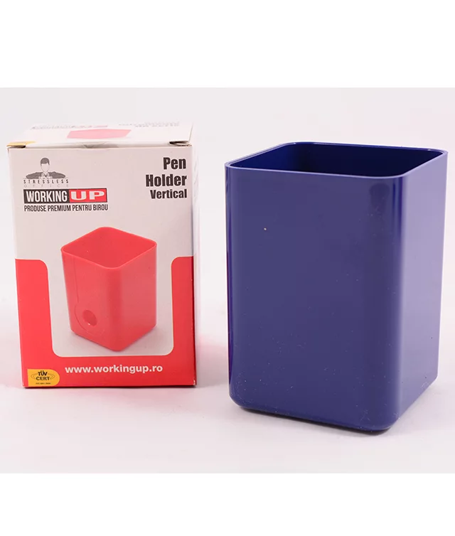 Suport vertical pentru instrumente de scris Working Up, realizat din plastic rezistent în nuanță albastră vibrantă. Design modern cu formă pătrată și compartiment generos, ideal pentru organizarea eficientă a pixurilor, creioanelor și markerelor pe birou sau acasă.