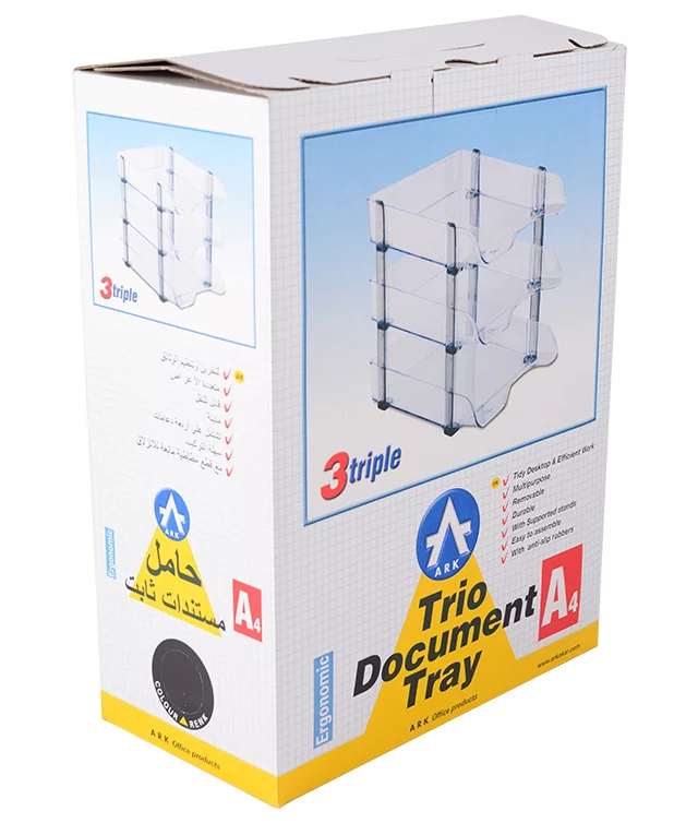Set de 3 tavite ARK din plastic transparent pentru organizarea documentelor, format A4, cu design ergonomic și compartimente multiple. Perfecte pentru birou, aceste tavite oferă soluții practice de stocare și acces rapid la documente, fiind ambalate convenabil într-o cutie.