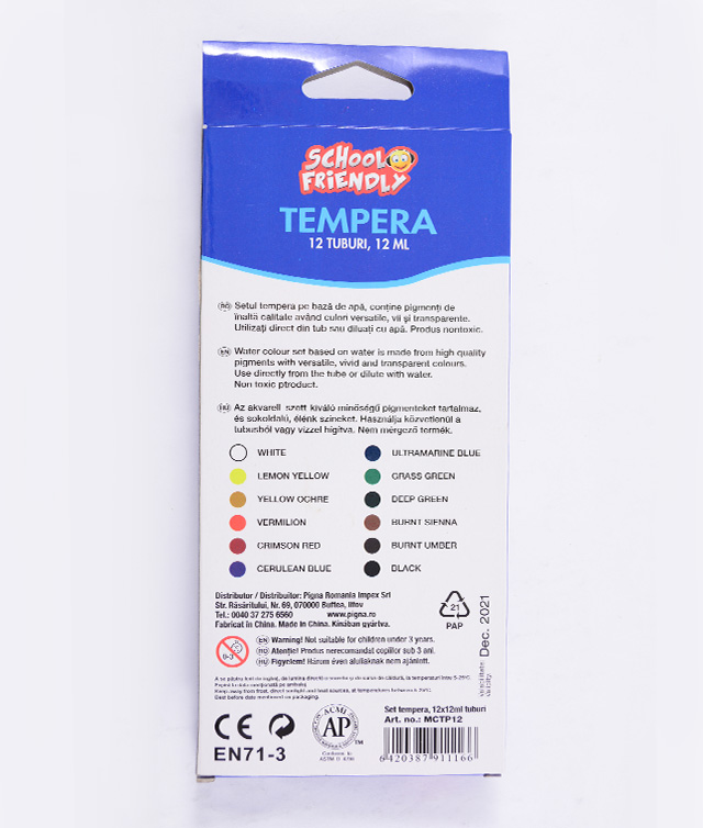Setul tempera pe baza de apa, contine pigmenti de inalta calitate avand culori versatile, vii si transparente. Utilizati direct din tub sau diluati cu apa. Produs nontoxic.