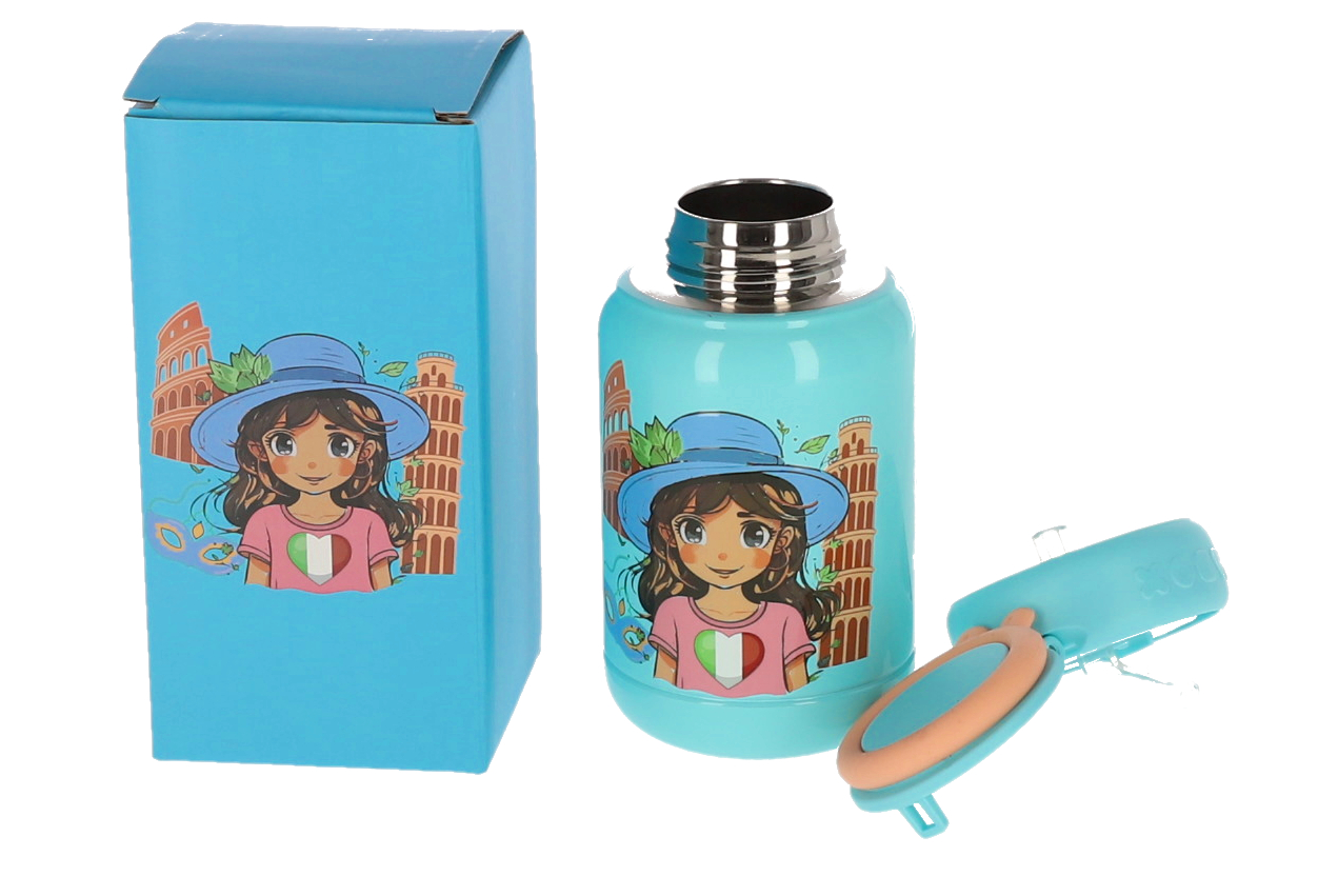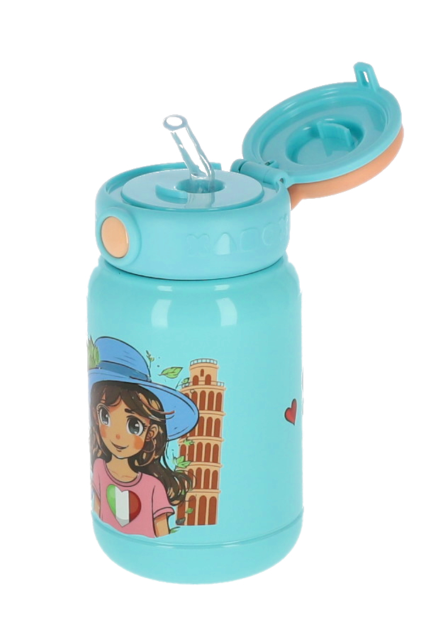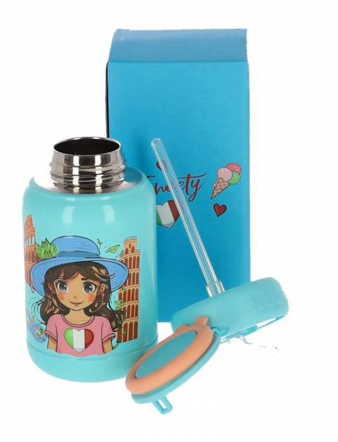 Termosul pentru lichide Sweety de 450ml este perfect pentru copii, având design turcoaz vibrant cu ilustrații vesele și capac cu pai retractabil. Cu dimensiuni compacte de 16×7,5 cm și greutate de doar 250g, acest termos termoizolant este ideal pentru școală, excursii sau activități zilnice, menținând băuturile la temperatura dorită.
