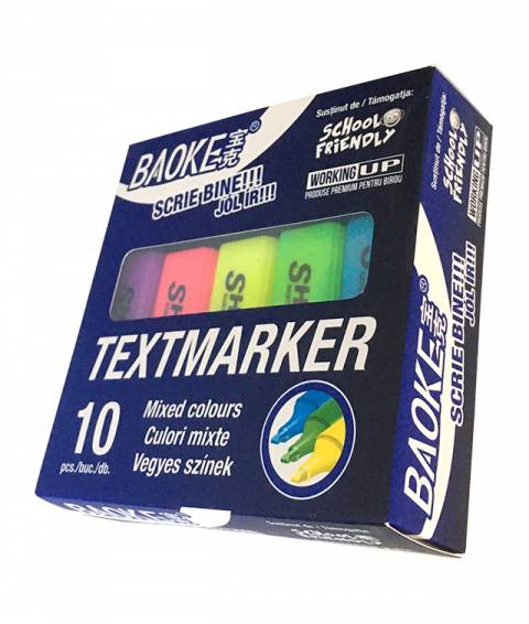 Set de 10 textmarkere Baoke Classic în culori mixte vibrante, perfecte pentru evidențierea textului în documente, cărți și notițe. Markere cu cerneală fluorescent de calitate, vârf rezistent și design ergonomic pentru utilizare îndelungată la birou, școală sau acasă.