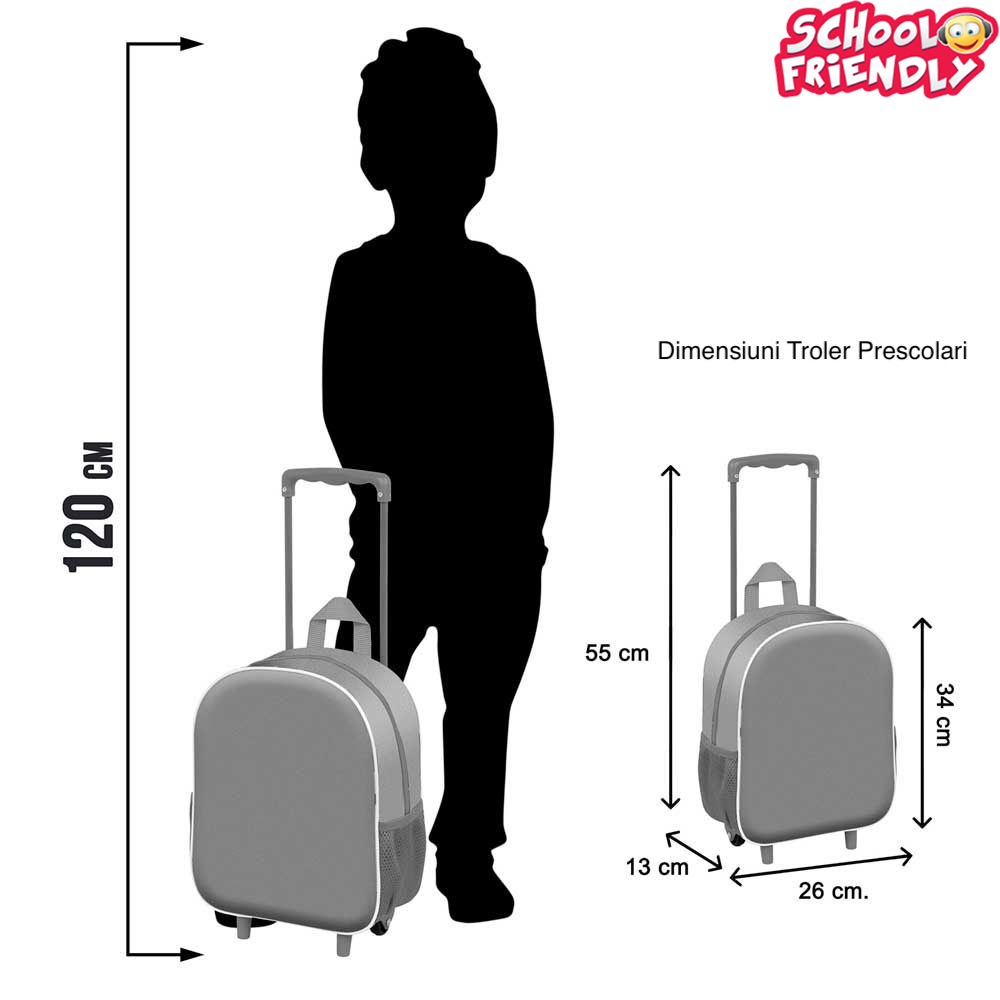 Troler non-detașabil: Trolerul este atașat permanent, oferind o modalitate convenabilă pentru copii de a-și transporta ghiozdanul fără a-l purta în spate.