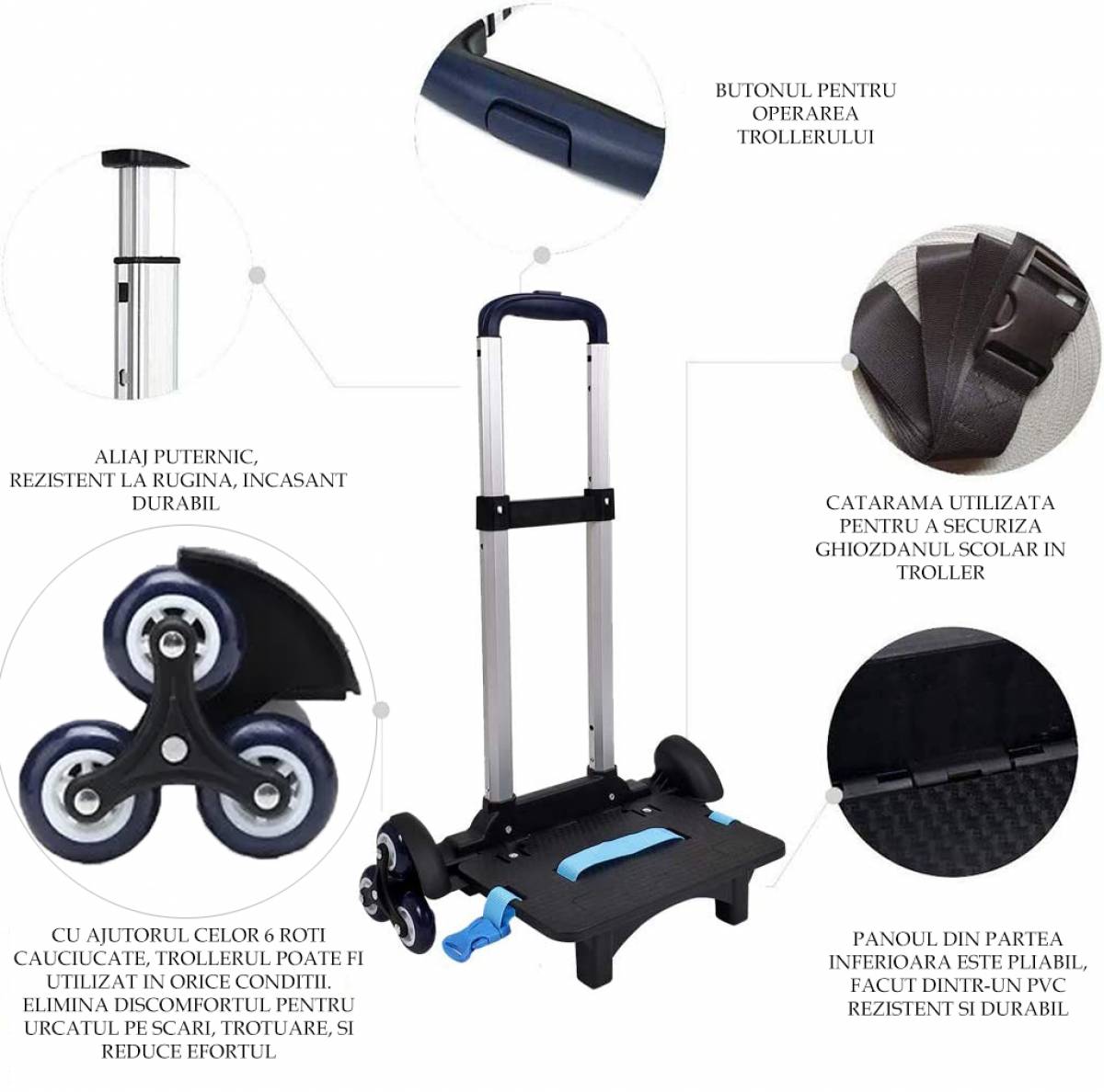 - Troller Detasabil: Echipat cu un troller detasabil și 6 roți, asigurând o manevrabilitate ușoară pe diverse suprafețe.