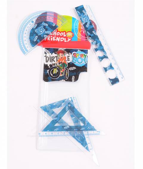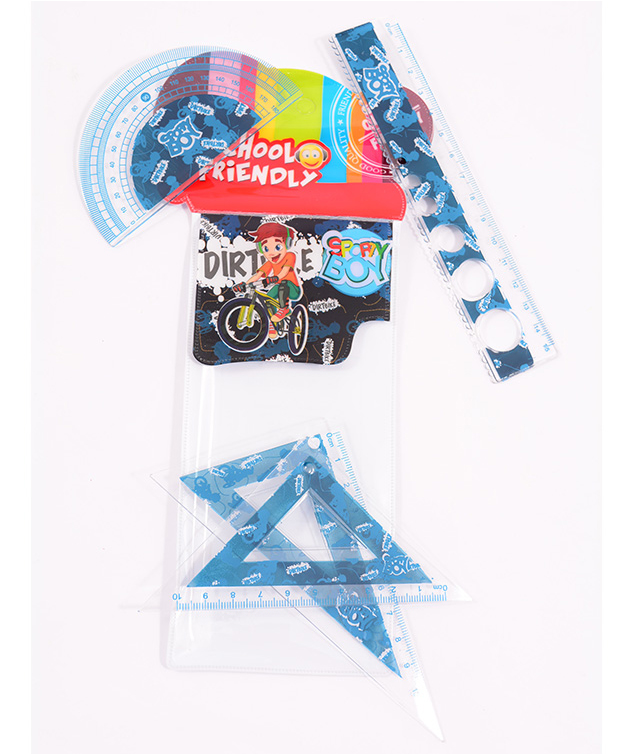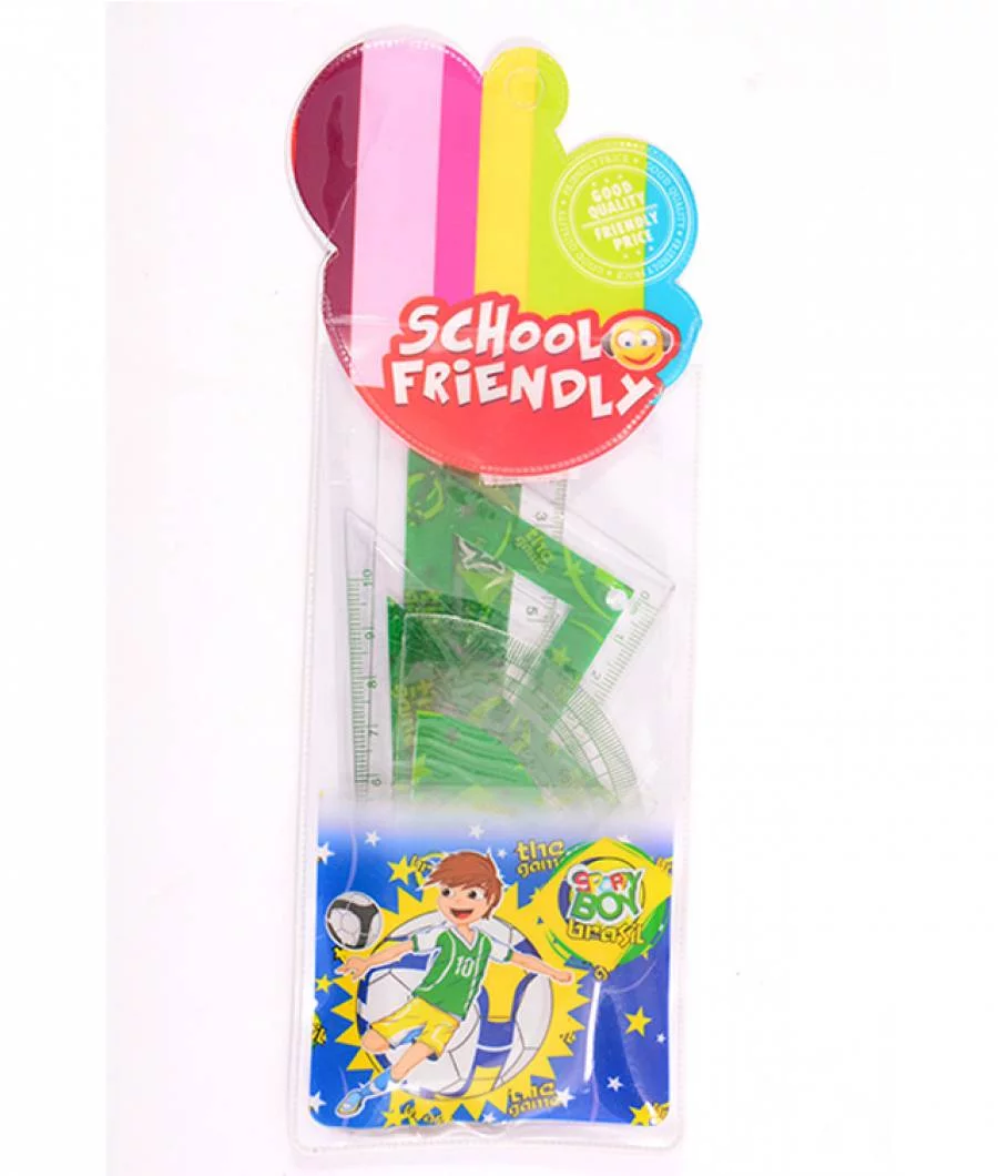 Trusa geometrie School Friendly pentru băieți include riglă, echer și raportor din plastic transparent verde, ambalate într-o cutie practică cu design colorat cu fotbalist. Set complet de instrumente geometrice pentru școală, ideal pentru desenul tehnic și lecțiile de matematică.